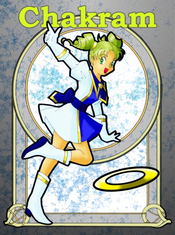 インド北部に住むシーク教徒が用いた武器。平べったい円形のわっかの外側に刃がついていて、これをエイやっと投げて敵を攻撃するのです。しかし実際に絵に描いて見れば見るほど、初期にセラムンが投げていた武器に似ている・・・というわけで、この絵はコミック1巻の某頁を参考にして描きました、と懺悔(しかし月野うさぎって中学生の体型じゃないよなぁぶつぶつ)。