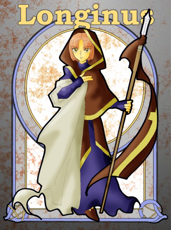 何故目の見えない人が軍人、しかも隊長になれたのか、とかツッコミどころの多いエピソードですが、神話というのはえてしてご都合主義な部分がありますので、この際不問にするとして、困ったのは絵を描くにあたって、その形状がよくわからないところにあります。聖書にはそんな細かいところまで載ってないし、まぁローマ兵士の槍なら普通の軍隊支給品なんじゃないかと思い、上記のような至って華の無いデザインになりました。