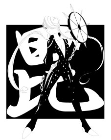 かずが嬢は何人かいる架空キャラですが、突っ込みどころは他の実在武将に負けず劣らずです。まず、今回白黒イラストなのでチトわかり辛いですが、そりゃあもう見事な金髪です。着ている衣装は素材不明のピッチピチジャンプスーツで、胸は半分以上出てるし、腰のあたりも意味無く露出。とても忍者とは思えない目立ちっぷりですね。こんな峰不二子ばりのセクシーギャルでは性格もさぞかしヴァンプなのではないかと思われがちですが、これがまた美少年の主君(上杉謙信)への叶わぬ恋に悩む典型的な乙女キャラと、見た目とのギャップは全キャラ中随一です。