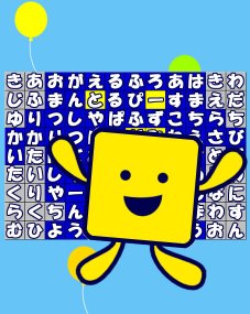 もじくんはまぁ何というか、このゲームのメインイメージキャラみたいなもんです(それにしても最近のナムコは「もじくん」とか「ホリススム」とか「和田どん」とか、キャラにマンマな名前をつけたがるなぁ(^^;)。背景の方はアーケードの106(ハード)で、今んところ一番高得点を出した時の解をトレースしてみました。縦の「あふりかたいりく」や横の「まんとるぴーす」がいい感じに目だってますが、最下段に入れた「ひようしようじよう」が一番効いて、約10万点。